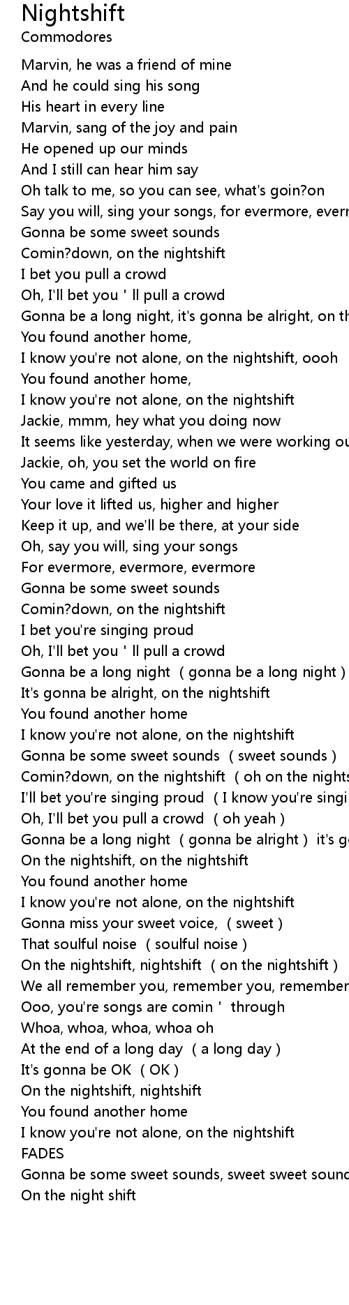 | [04:23.16] | On the nightshift, nightshift (on the nightshift) |