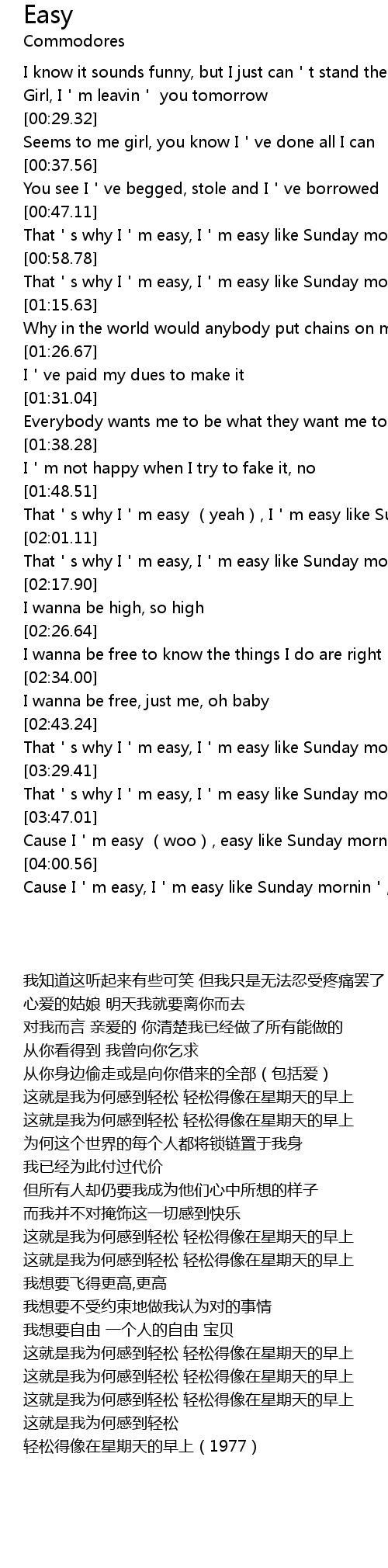 | [01:03.89] | That's why I'm easy, I'm easy like Sunday mornin' |