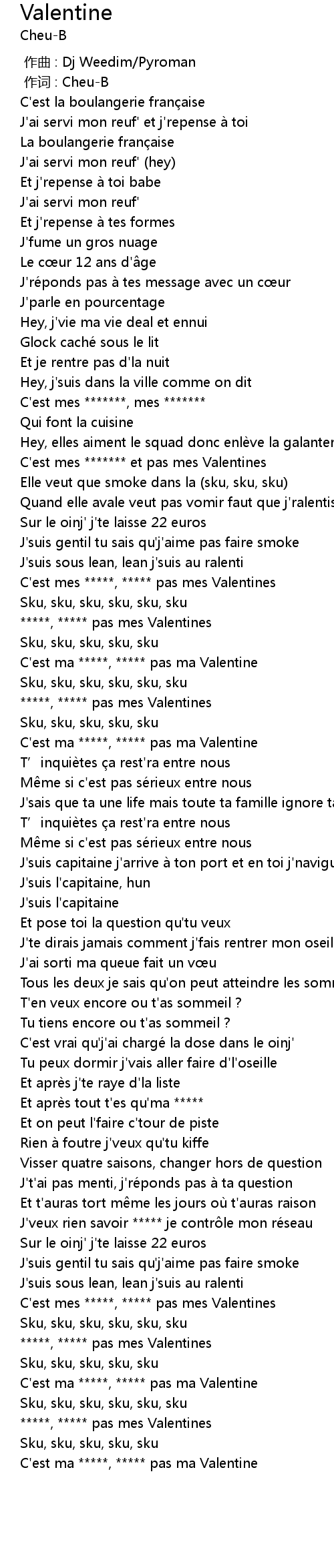 | [00:59.21] | C'est mes *****, ***** pas mes Valentines |