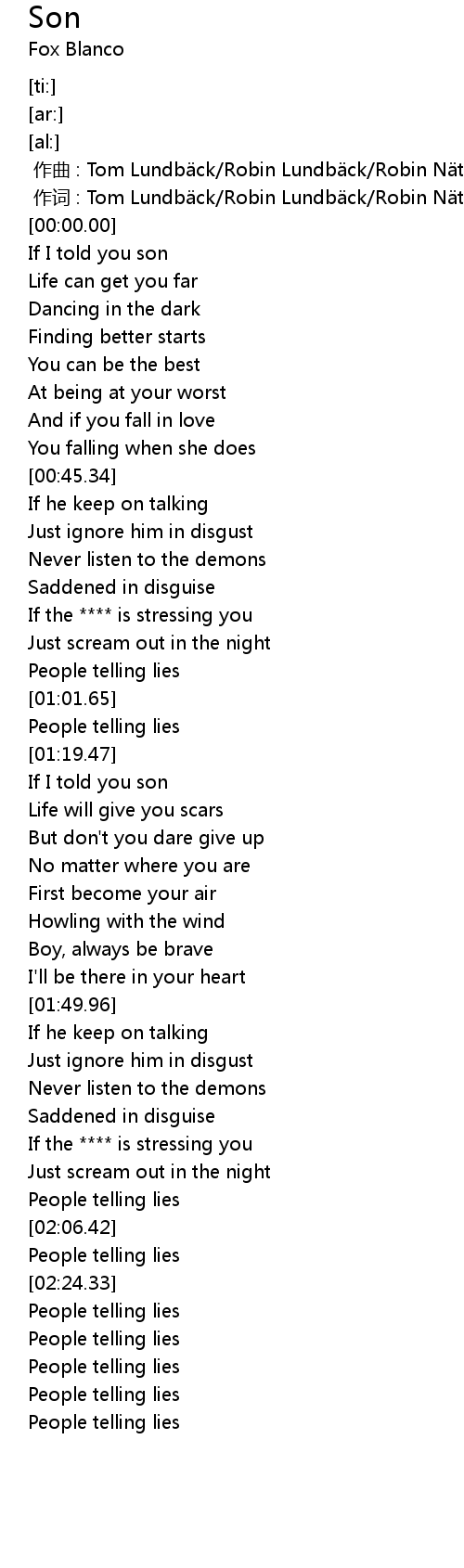 | [00:00.000] | zuò cí : Tom Lundb ck Robin Lundb ck Robin N tterlund |