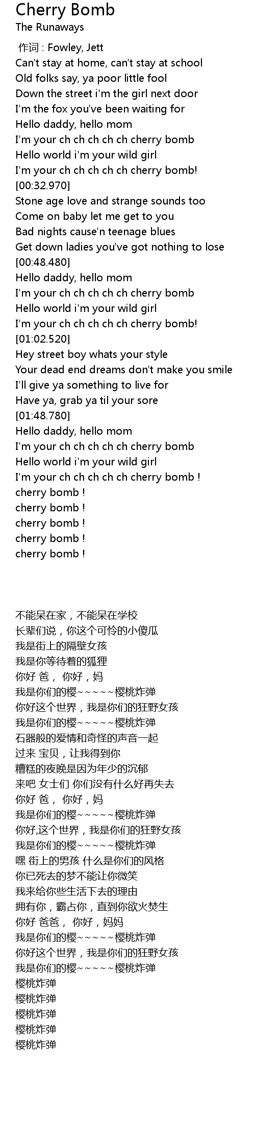 | [01:59.530] | I' m your ch ch ch ch ch cherry bomb ! |