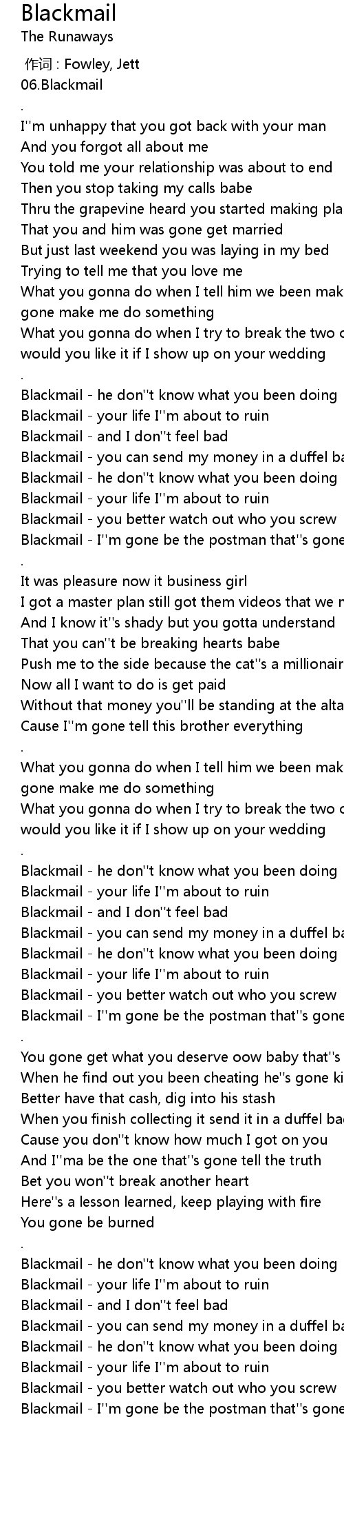 | [00:56.76] | Blackmail - your life I''m about to ruin |