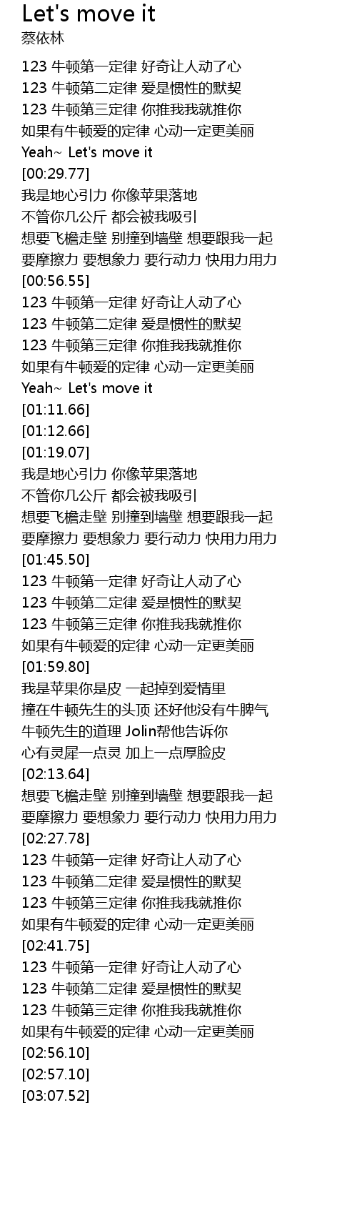 | [02:07.16] | 牛顿先生的道理 Jolin帮他告诉你 |