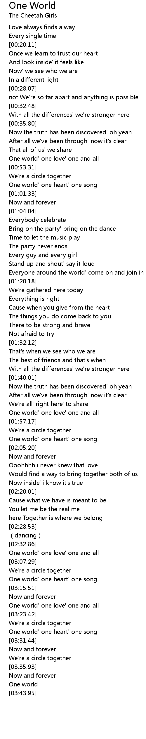 | [03:02.41] | One world' one love' one and all |