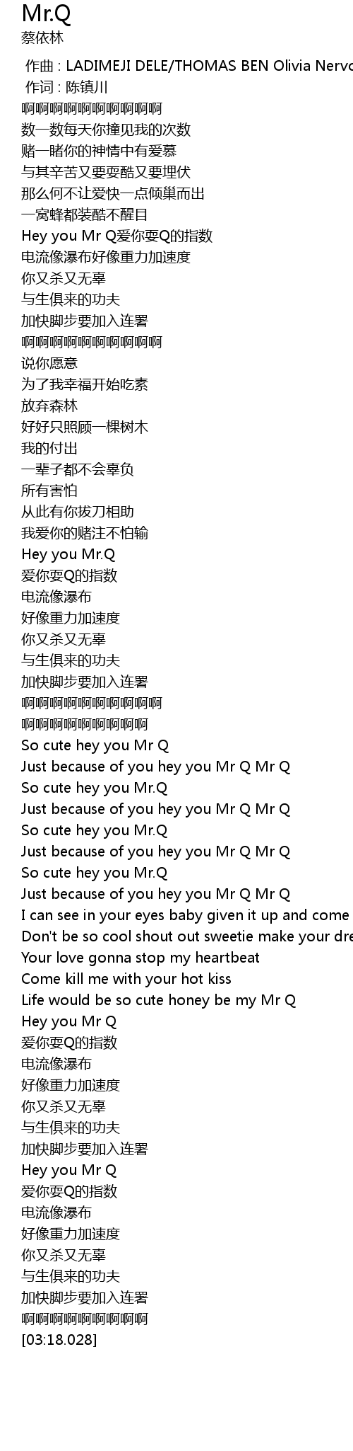 | [02:13.190] | Just because of you hey you Mr Q Mr Q |