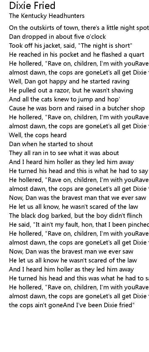 He hollered, "Rave on, children, I'm with youRave on, cats", he cried"It's almost dawn, the cops are goneLet's all get Dixie fried""Yeah, it's almost dawn, the cops ain't goneAnd I've been Dixie fried" |