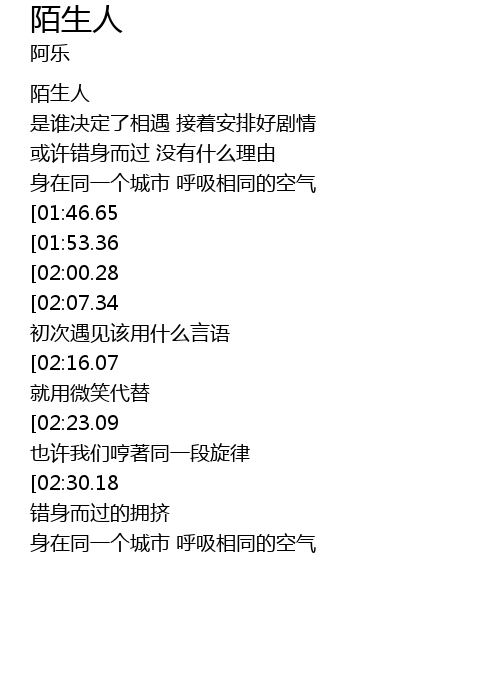 | [00:54.59][02:07.34][02:39.21] | 陌生的人 陌生的距离 初次遇见该用什么言语 |