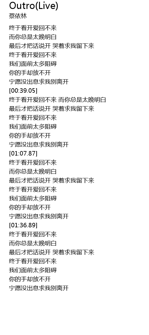 | [01:43.97] | 最后才把话说开 哭着求我留下来 |