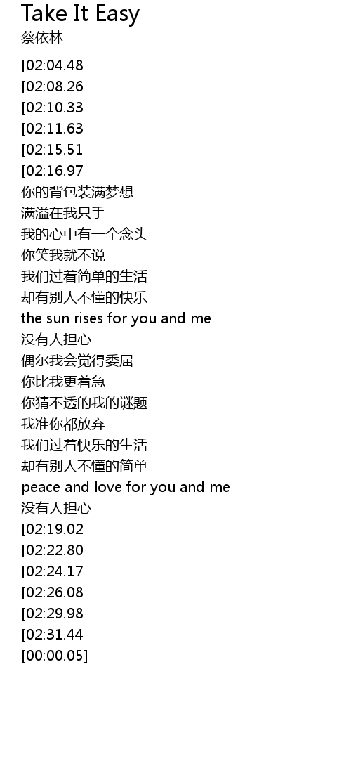 | [03:11.35][02:11.63][01:13.29][00:13.70] | come on take it easy,babe |
