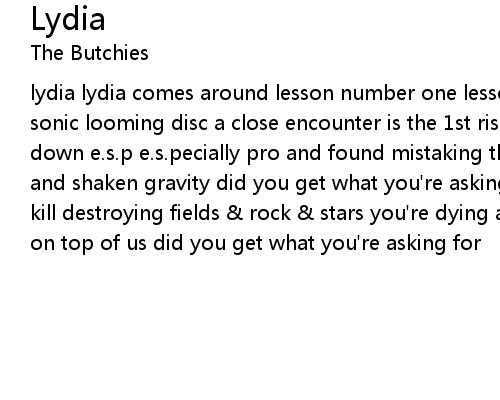 | lydia lydia comes around lesson number one lesson the sound in breaking this sonic looming disc a close encounter is the 1st risk a psychic a physic a break down e.s.p e.s.pecially pro and found mistaking this floating space for right and shaken gravity did you get what you're asking for hideous hideous people kill destroying fields & rock & stars you're dying and vying for the break to be on top of us did you get what you're asking for |