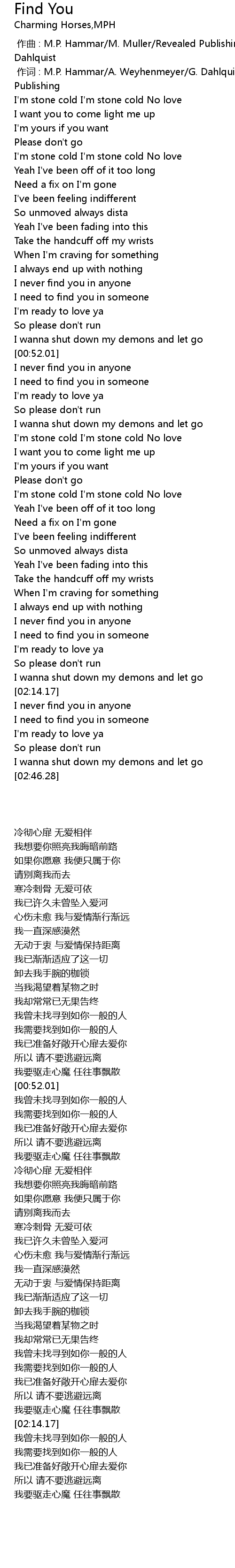 | [00:01.000] | 作词 : M.P. Hammar/A. Weyhenmeyer/G. Dahlquist/M. Muller/Revealed Publishing |