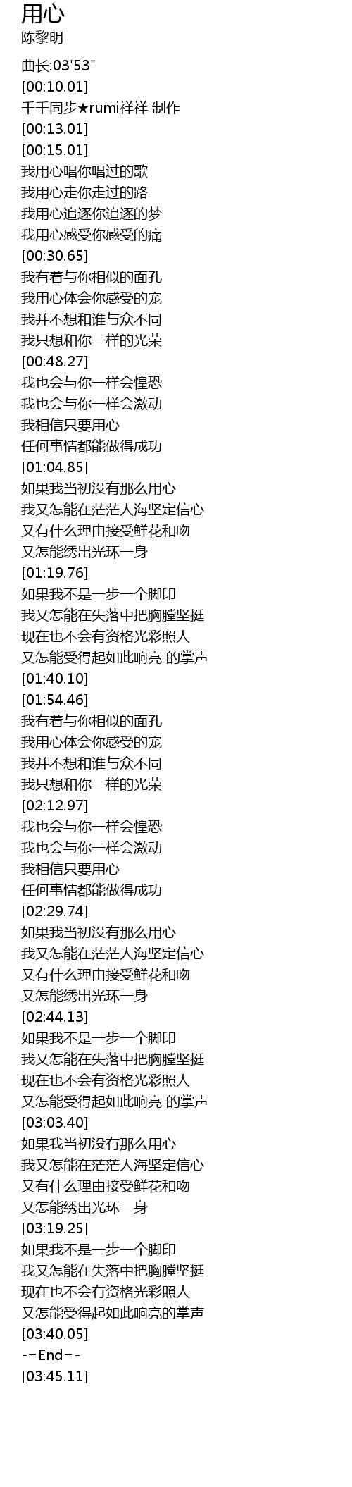 | [00:15.41] | wǒ yòng xīn chàng nǐ chàng guò de gē |