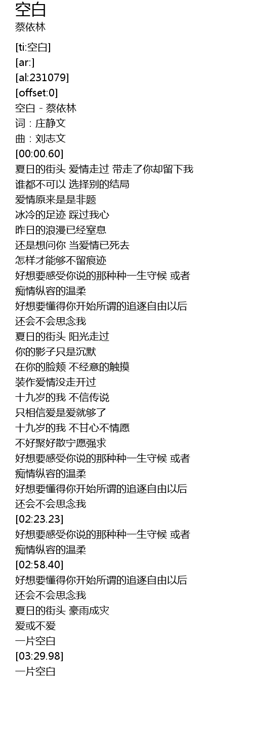 | [00:00.10] | 空白 - 蔡依林 |