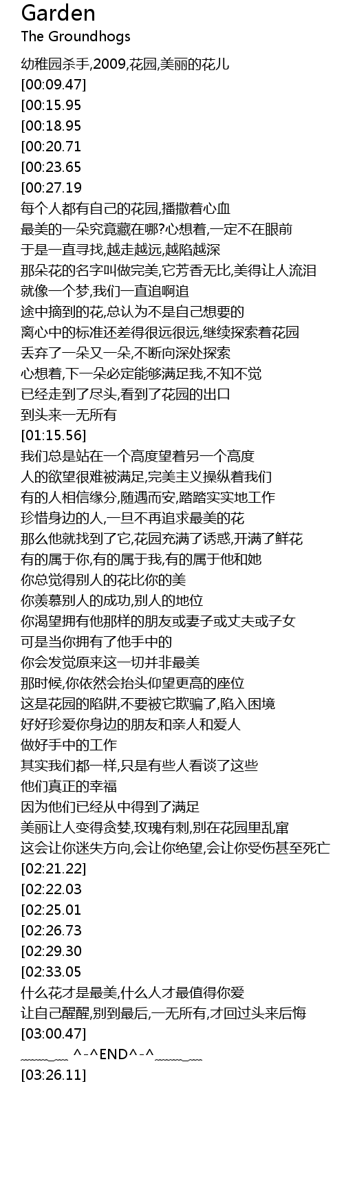 | [00:03.70] | 幼稚园杀手,2009,花园,美丽的花儿 |