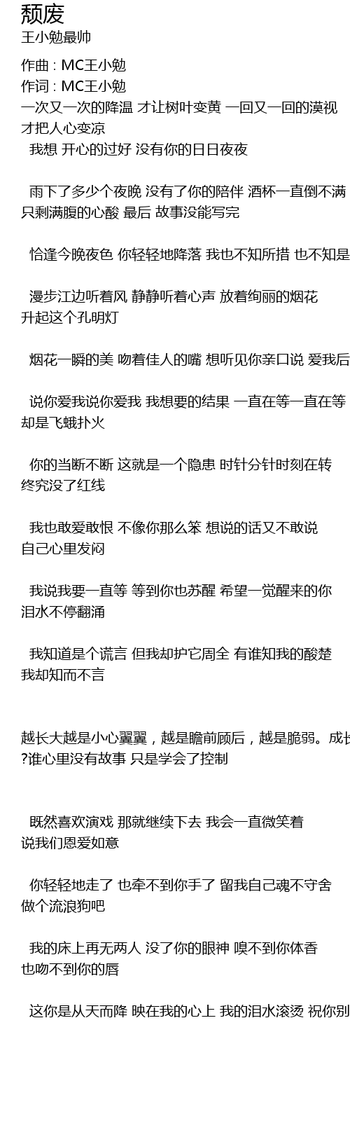 | yǔ xià le duō shǎo gè yè wǎn méi yǒu le nǐ de péi bàn jiǔ bēi yī zhí dào bù mǎn zhǐ shèng mǎn fù de xīn suān zuì hòu gù shì méi néng xiě wán | |