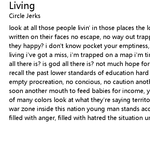 look at all those people livin' in those places the look of desparation's written on their faces no escape, no way out trapped in a circle of doubt are they happy? i don't know pocket your emptiness, what does it show? living, just living i've got a miss, i'm trapped on a map i'm tired to be something is god all there is? is god all there is? not much hope for any future no desire to recall the past lower standards of education hard to think when your stomach's empty procreation, no concious, no caution another one, look what's you've done soon another mouth to feed babies for income, you can't be doing that thoughts of many colors look at what they're saying territorial frustration there is a war zone inside this nation young man stands accused street light, nothing new filled with anger, filled with hatred the situation understated |