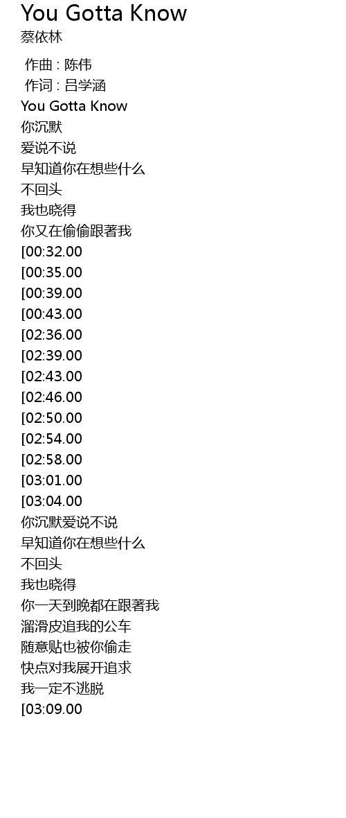 | [03:19.00][02:36.00][00:45.00] | I gotta to know, I gotta know |