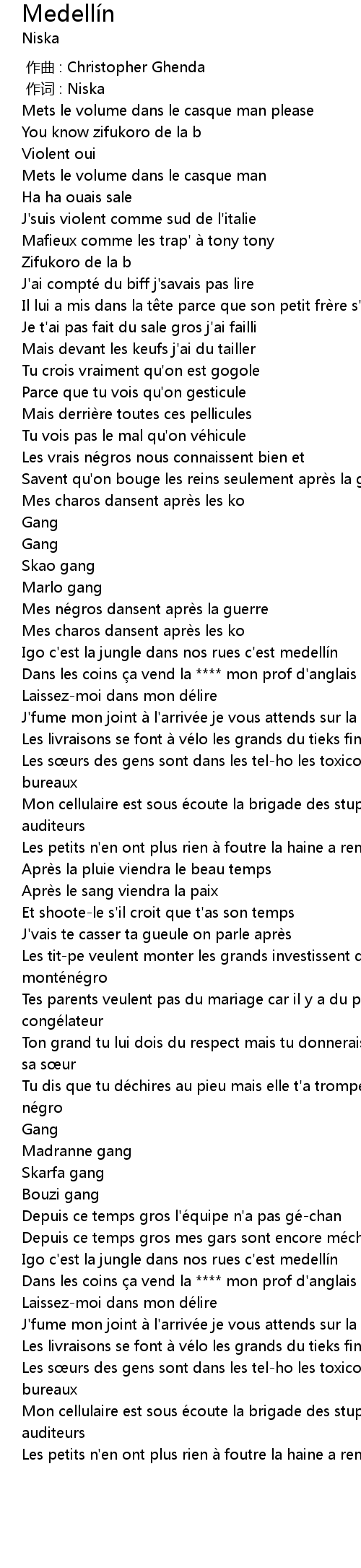 | [02:16.01] | Igo c' est la jungle dans nos rues c' est medelli n |