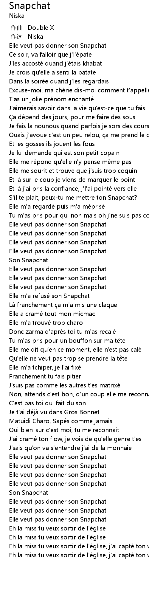 | [00:57.76] | Elle veut pas donner son Snapchat |