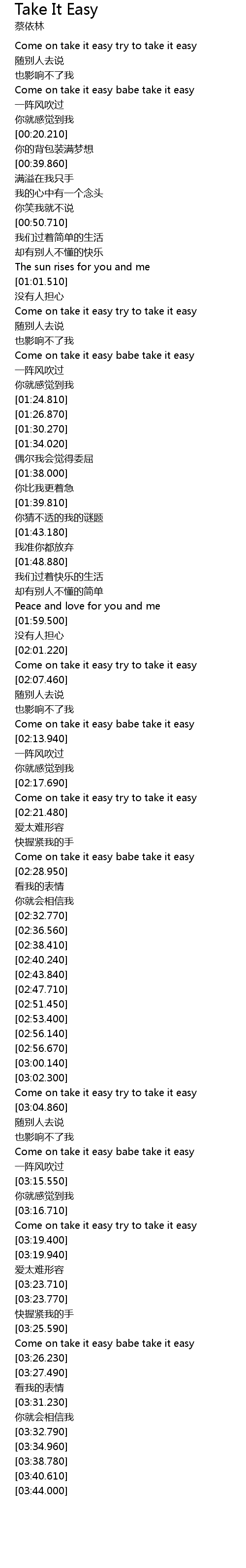 | [02:18.750] | Come on take it easy try to take it easy |