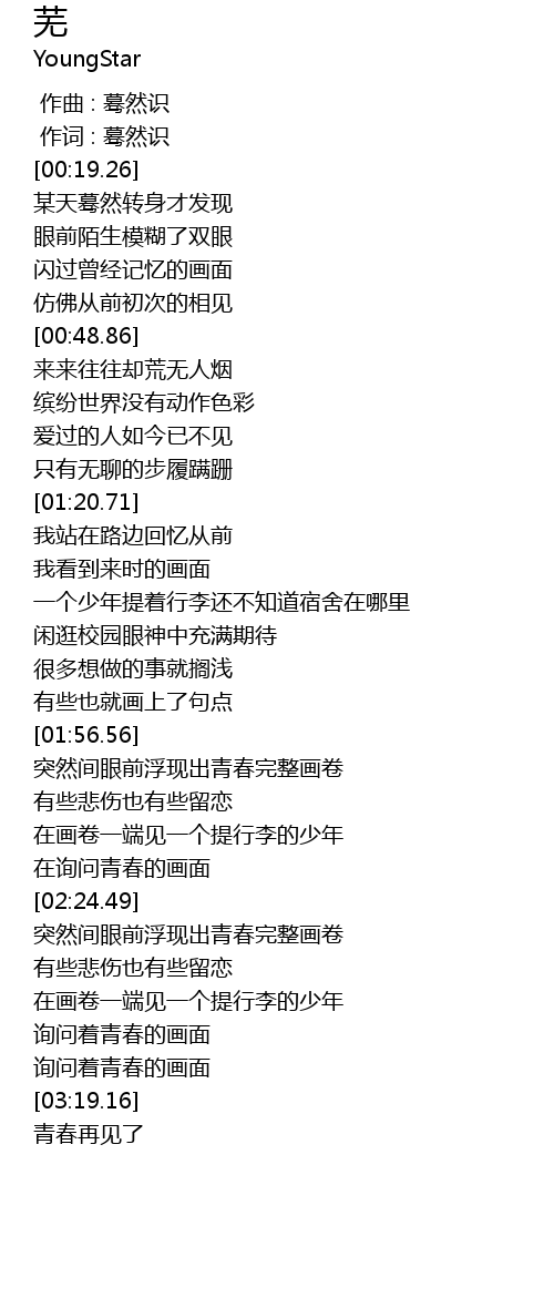 | [02:17.12] | zài xún wèn qīng chūn de huà miàn |