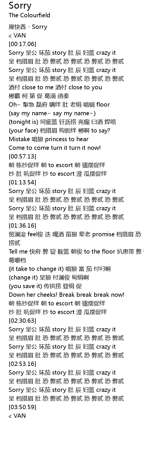 | [00:19.06] | Sorry 呈公 环茄 story 肚 辰 妇篮 crazy it |