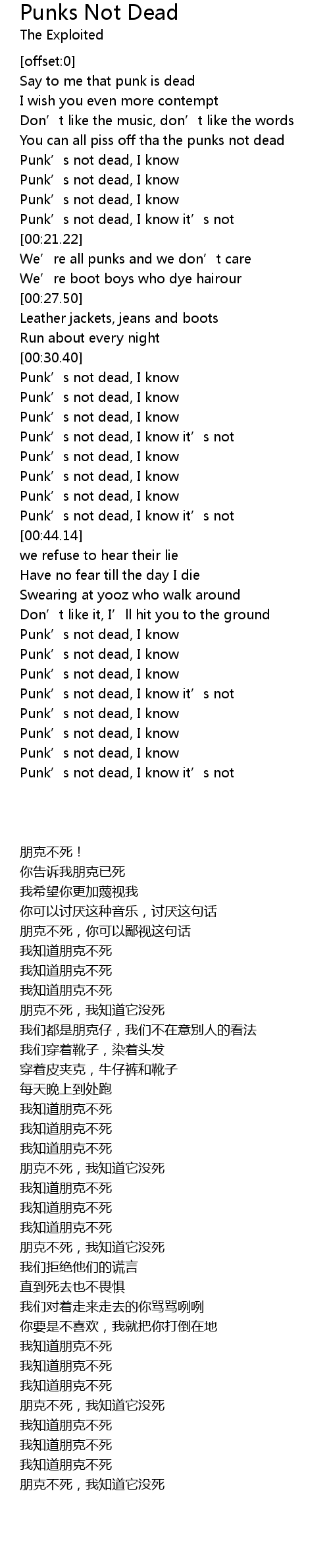 | [00:18.86] | Punk' s not dead, I know it' s not |