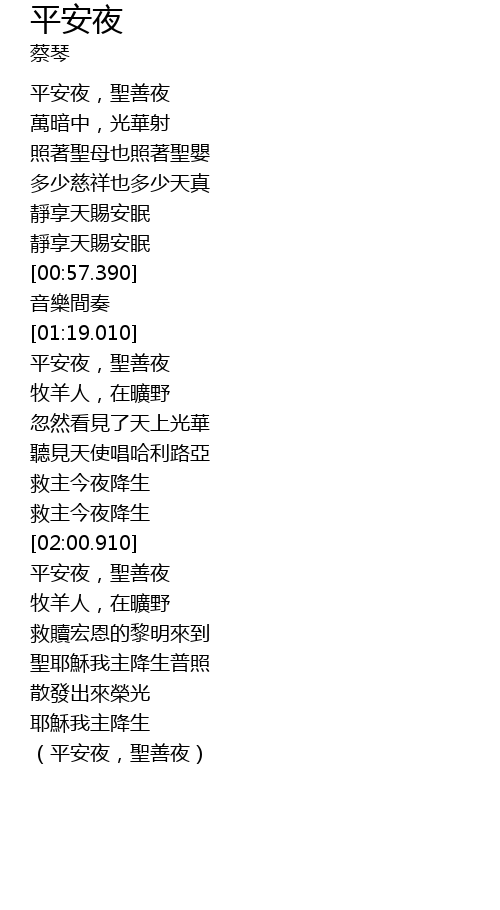 | [01:57.290] | 救主今夜降生 |