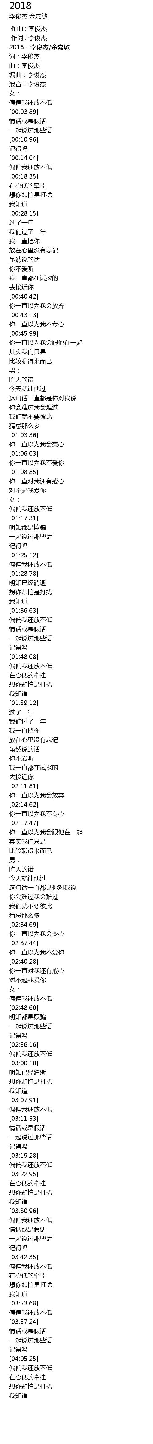 | [00:00.01] | 2018 - 李俊杰/余嘉敏 |