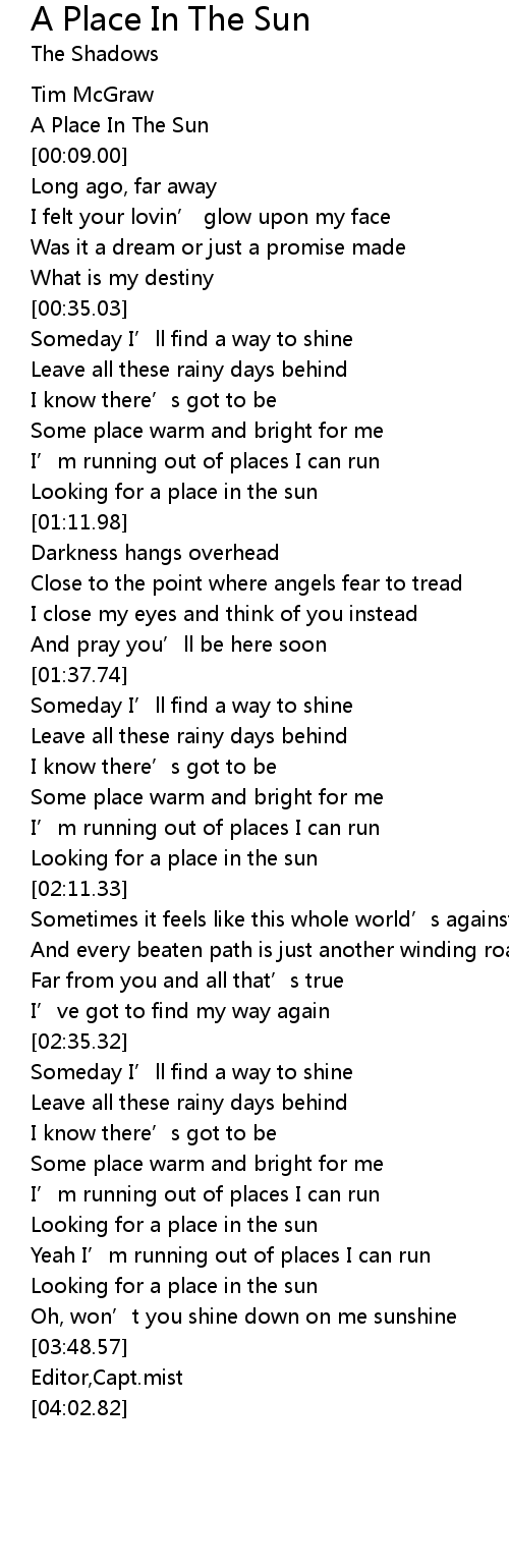 | [03:35.71] | Oh, won' t you shine down on me sunshine |
