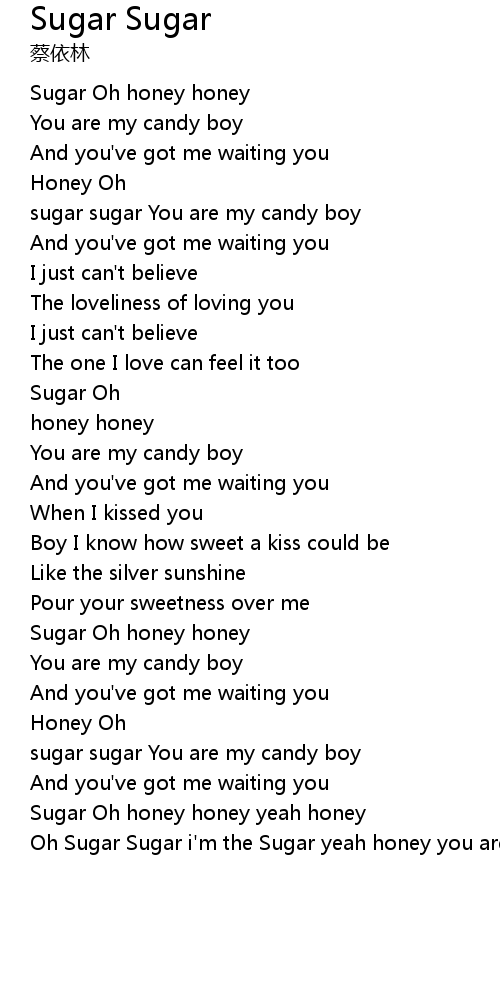 | [03:11.550] | Sugar Oh honey honey yeah honey |
