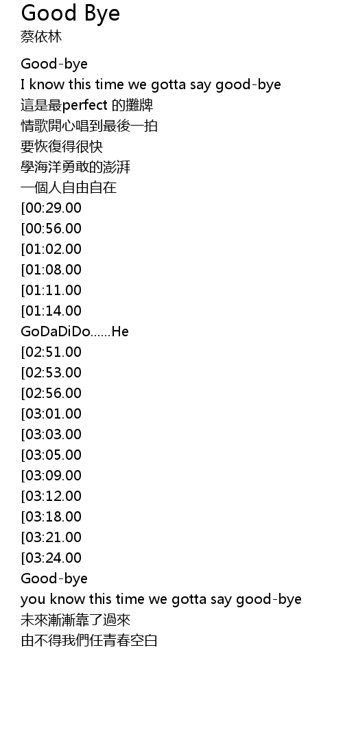 | [03:29.00][02:51.00][02:39.00][01:22.00] | Goodbye |