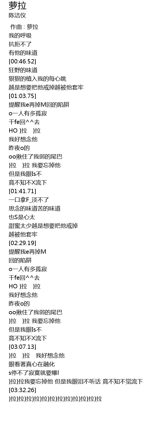 | [03:20.45] | }拉}拉我要忘掉他 但是我眼泪不听话 竟不知不觉流下 |