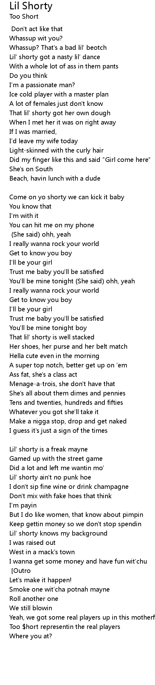 Lil' shorty what'chu wanna do? [Chorus] [Outro] |