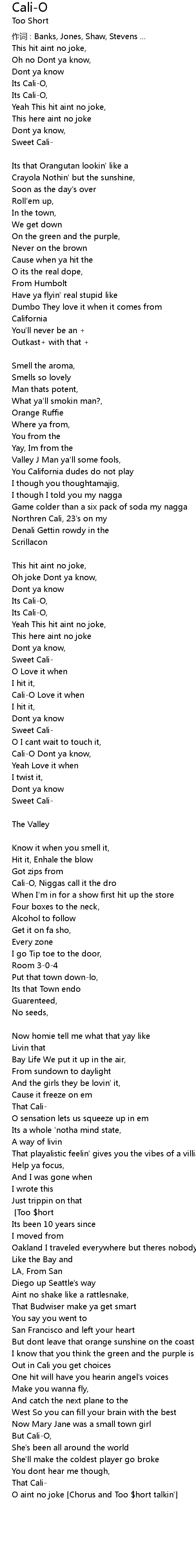 | Cali-O, Its known to be the dopest [Chorus with minor variations] [Too $hort] | |