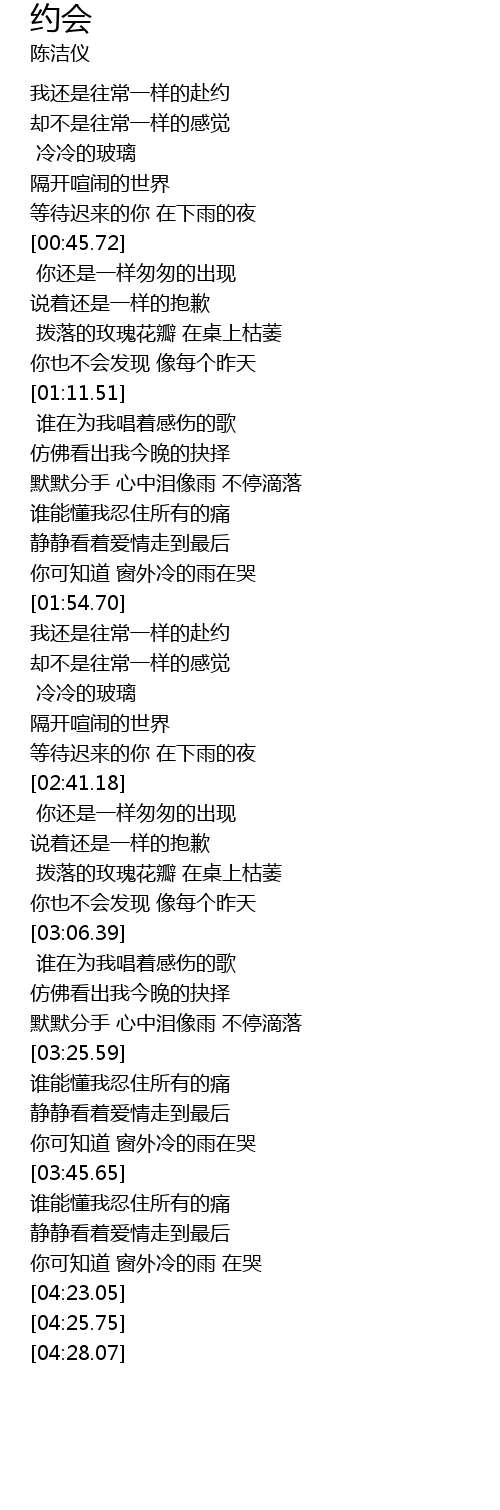 | [01:25.72] | 默默分手 心中泪像雨 不停滴落 |