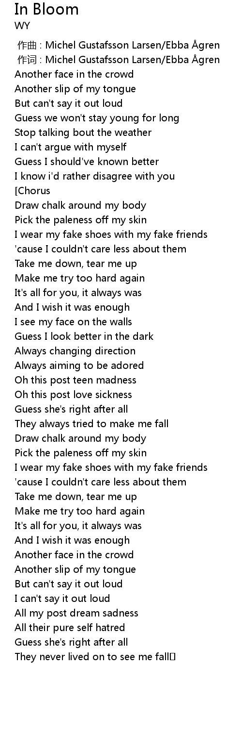 | [00:01.000] | 作词 : Michel Gustafsson Larsen/Ebba Ågren |