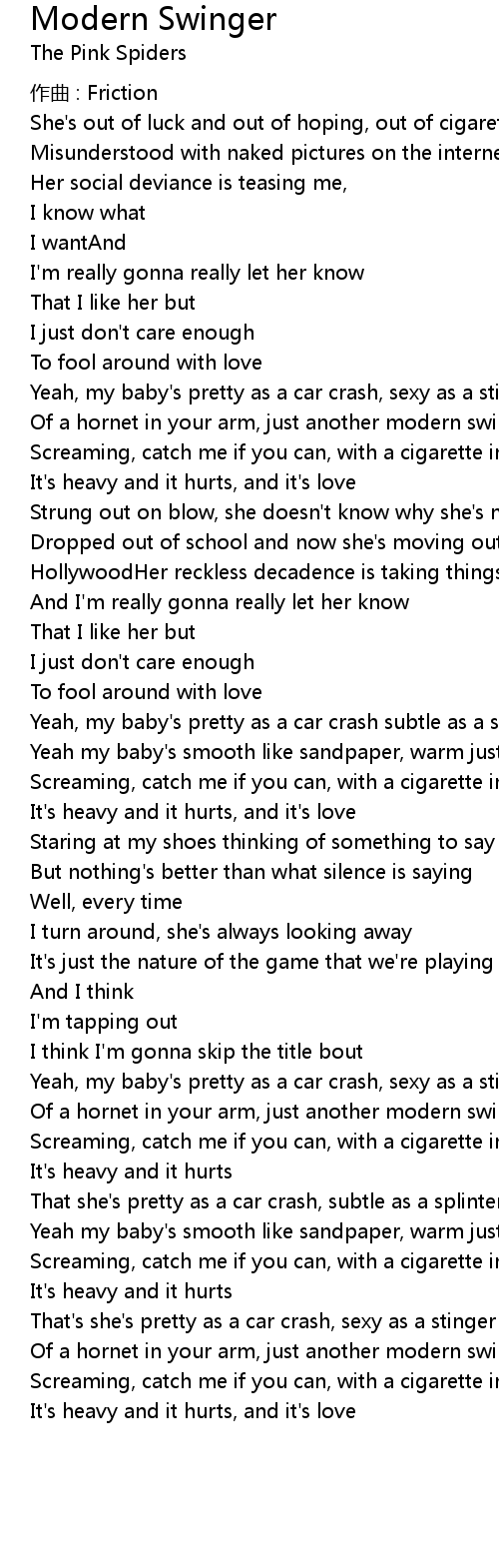 | Yeah, my baby's pretty as a car crash, sexy as a stinger | |