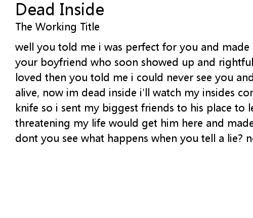 well you told me i was perfect for you and made me think i was and hid from me your boyfriend who soon showed up and rightfully stole the one thing i ever loved then you told me i could never see you and made me what i am today i was alive, now im dead inside i'll watch my insides coming out tonight with this knife so i sent my biggest friends to his place to let him know how far this threatening my life would get him here and made the big mistake of my whole life dont you see what happens when you tell a lie? now people lose their lives |