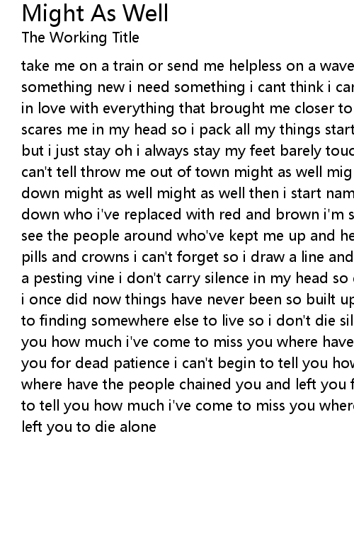 take me on a train or send me helpless on a wave that i cant hang with i need something new i need something i cant think i cant create its all the same i'm in love with everything that brought me closer to hell and closer to all that scares me in my head so i pack all my things start tracing arrows with my brain but i just stay oh i always stay my feet barely touch the ground i'm alive but i can't tell throw me out of town might as well might as well burn the whole place down might as well might as well then i start naming names and start scratching down who i've replaced with red and brown i'm so caught up with myself i can't see the people around who've kept me up and held me down and filled my head with pills and crowns i can't forget so i draw a line and start splitting names like a pesting vine i don't carry silence in my head so easy, free and careless like i once did now things have never been so built up like a dam and i'm this close to finding somewhere else to live so i don't die silence i can't begin to tell you how much i've come to miss you where have the people chained you and left you for dead patience i can't begin to tell you how much i've come to miss you where have the people chained you and left you for dead kindness i can't begin to tell you how much i've come to miss you where have the people chained you and left you to die alone |
