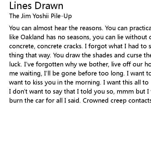 You can almost hear the reasons. You can practically mouth the words. And just like Oakland has no seasons, you can lie without concern. Crowned creep contacts concrete, concrete cracks. I forgot what I had to say- tension is such a funny thing that way. You draw the shades and curse the neighbors. You curse your bad luck. I've forgotten why we bother, live off our hopes for the other. You keep me waiting, I'll be gone before too long. I want to show you what art means, I want to kiss you in the morning. I want this all to blow over, blow over again. I don't want to say that I told you so, mmm but I told you so. Kill the kids and burn the car for all I said. Crowned creep contacts concrete, concrete cracks. |