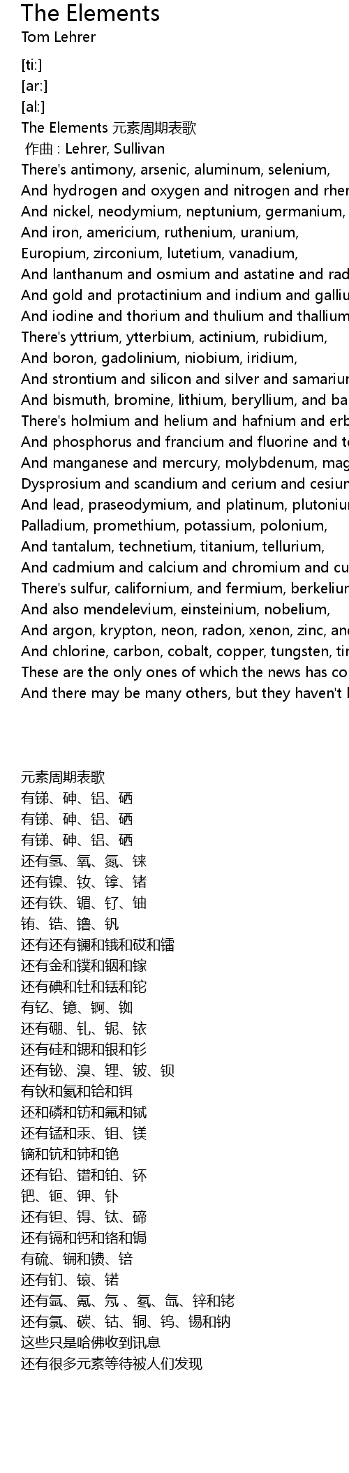 | [00:09.580] | Tom LehrerThere's antimony, arsenic, aluminum, selenium, |