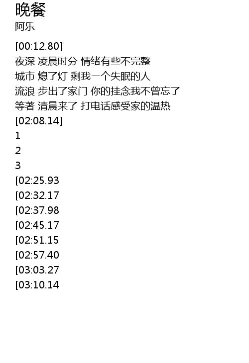 | [04:06.87][03:10.14][01:54.16] | 无时无刻等待你的靠岸 等你的晚餐 |