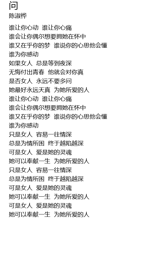 | [01:18.900] | shì fǒu nǚ rén yǒng yuǎn bú yào duō wèn |