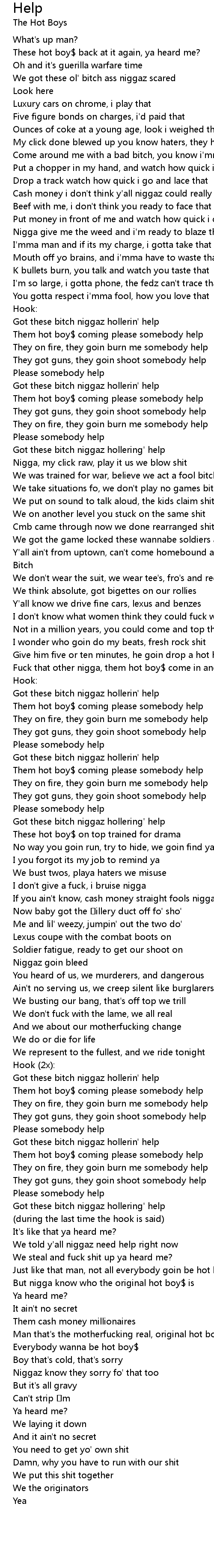 | Got these bitch niggaz hollerin' help | |