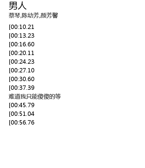 | [01:27.67][00:37.39] | 男人 究竟有多好有多残忍 难道我只能傻傻的等 |