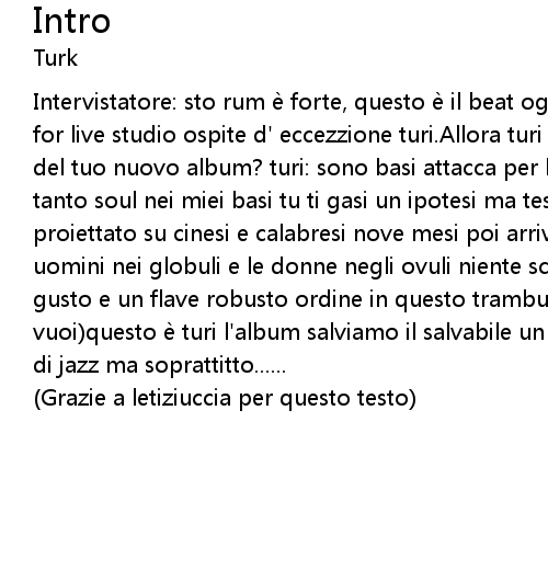 | Intervistatore: sto rum e forte, questo e il beat oggi insieme a noi al piz for live studio ospite d' eccezzione turi. Allora turi ci fai sentire qualcosa del tuo nuovo album? turi: sono basi attacca per le mie frasi fasi che ci sia tanto soul nei miei basi tu ti gasi un ipotesi ma tesi e il morbo di new york proiettato su cinesi e calabresi nove mesi poi arriva il suono per i popoli gli uomini nei globuli e le donne negli ovuli niente scapoli ammogliati col buon gusto e un flave robusto ordine in questo trambusto. intervistatore: che minchia vuoi questo e turi l' album salviamo il salvabile un po di funk di soul un po di jazz ma soprattitto...... | |