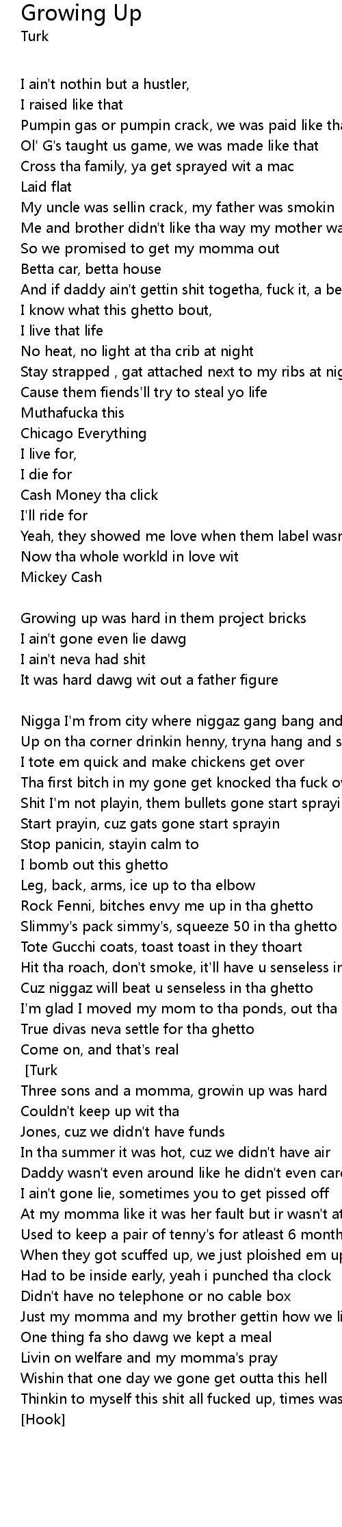 Thinkin to myself this shit all fucked up, times was heard for me dawg growin up [Hook] |