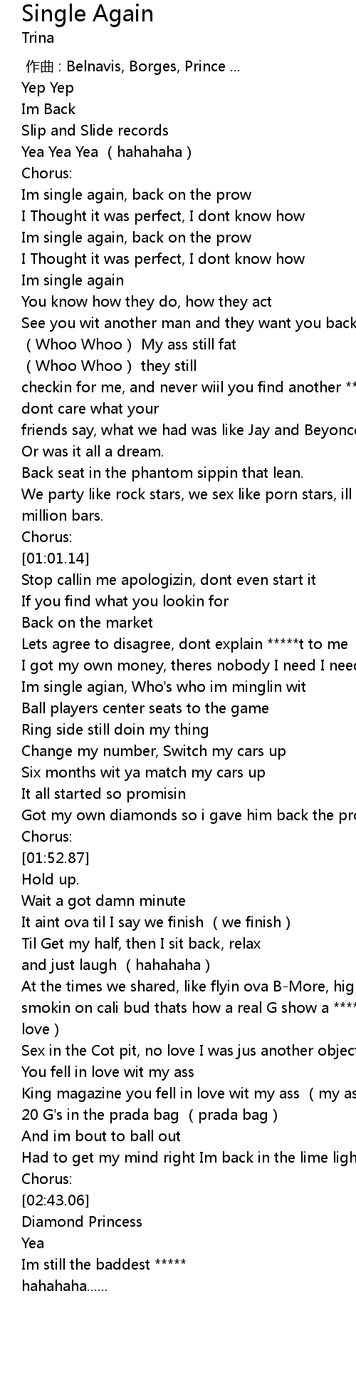 | [01:35.48] | Im single agian, Who's who im minglin wit |