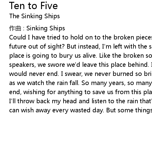 | Could I have tried to hold on to the broken pieces of those nights, with the future out of sight? But instead, I' m left with the sinking feeling that this place is going to bury us alive. Like the broken sounds coming from your speakers, we swore we' d leave this place behind. I held my breath, hoping this would never end. I swear, we never burned so bright. Now I sit back, feeling old as we watch the rain fall. So many years, so many bridges burned. Wishing for an end, wishing for anything to save us from this place, to save me from myself. So I' ll throw back my head and listen to the rain that' s falling on my face and I can wish away every wasted day. But some things will never change |